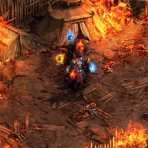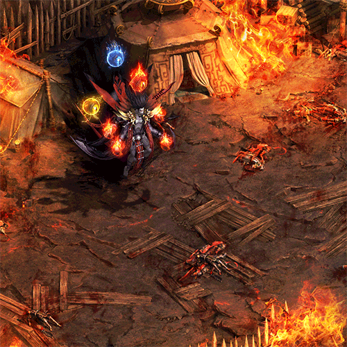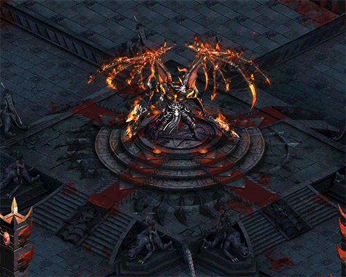 技能发动后,深渊领主在地图内随机释放火柱,所有火柱范围内的敌人受到持续高伤害。