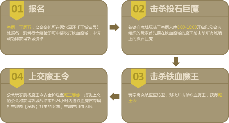 大型公会对战玩法,玩家只有以公会的名义方可报名加入,公会成员通过击杀投石巨兽和铁血魔王来获取魔王令,最终成功上交魔王令至魔王雕像的行会将获得进入疯狂打宝世界【魔殿】打宝的机会。而在任务过程中,行会间将会产生激烈的抢夺战。