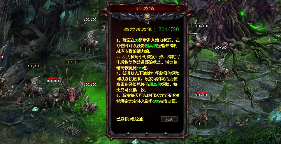 无论玩家在线与否,活力值每小时恢复2点,活力值最高恢复到720点。 活力值消耗完毕后将回到单倍经验状态,普通状态下继续打怪获得的经验可以累加,当活力值恢复后,可以消耗活力值立即兑换超高倍经验,每天只可兑换一次。