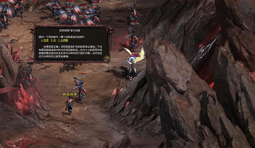 挖矿:装备幽暗石谷矿锄或点击矿石即可开始挖矿,挖矿会降低幽暗石谷矿锄的耐久度。挖矿时,系统将会有问题弹出,正确回答问题可提升挖矿收益,而回答错误则会受到小小的惩罚,一不小心还会被踢下线哦。同时,矿区内还有会有怪物随时出没,对玩家挖矿造成骚扰。